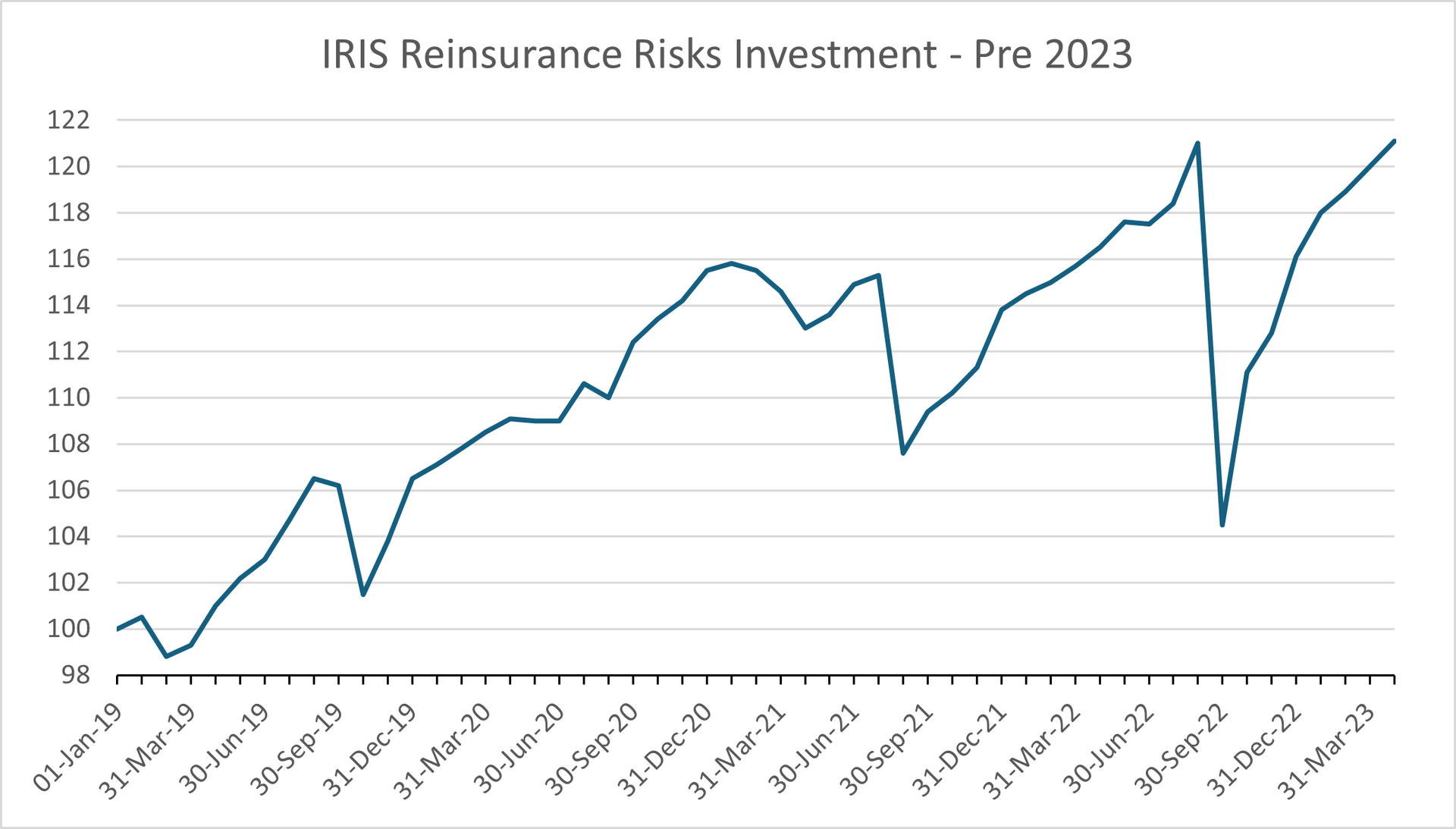 GRAPH 1 – Gross Performance of IRIS selected reinsurance risks investment. Period 01/2019 – 04/2023.