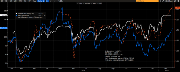 - Should the product not be early redeemed, the steep dividend term structure on those stocks means Investor can benefit from a positive roll up. Below is an example of an Athena Div structure using BNP FP Equity as underlying that early redeemed after one year.