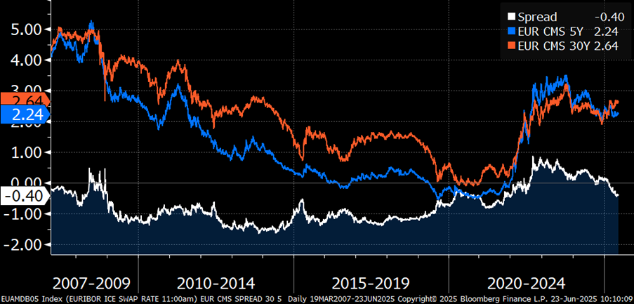 - The payoff benefits in a scenario where the EUR interest rate curve normalizes (switch from downward to upward slope) in the medium term (3-5 years horizon). The expected return of the product is 10% p.a. with a 3Yr duration.